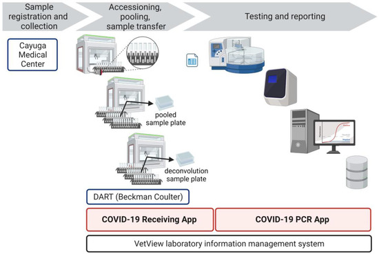 Considering the short time frame available to launch the laboratory, the workflow incorporated experienced faculty and staff from the Animal Health Diagnostic Center (AHDC)—a Level 1 member of the National Animal Health Laboratory Network (NAHLN)—and PCR instrumentation routinely used at AHDC for the testing of animal clinical samples. Similarly, the IT staff and application developers were familiar with the needs specific to diagnostic testing. CCTL was operated in partnership with Cayuga Medical Center (CMC) as they provided critical expertise in the regulations governing human diagnostic testing, quality control, and human laboratory testing operations. Herein, we describe the workflow that was designed and implemented to meet the considerations above and to optimize the laboratory’s performance.