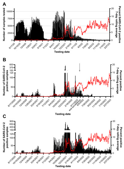 The results presented herein are based on SARS-CoV-2 testing from 17 August 2020 to 27 February 2023 unless noted otherwise. The first day of testing at CCTL was 17 August 2020 and 28 February 2023 marked the closure of the laboratory.