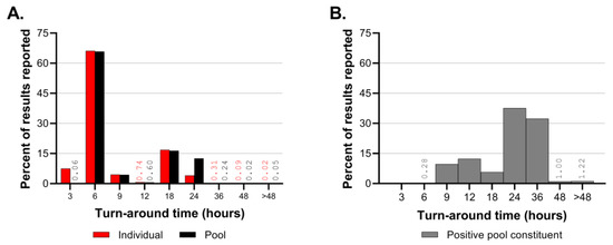 The emergence of the Delta and Omicron VOCs and the resultant increase in the prevalence of positive samples affected the laboratory’s workflow leading to longer turnaround times for pool deconvolution. Throughout the first 16 months of SARS-CoV-2 testing, the majority of pooled samples and individual test results were reported within 3–6 h. The TAT for positive pool constituent testing shifted from predominantly 6–12 h prior to September 2021 to predominantly 18–36 h in the fall of 2021. The number of samples requiring positive pool constituent testing increased from nearly 1200 to nearly 3800 in the month of September and exceeded 20,000 in December 2021. Although the Delta and Omicron outbreaks had a significant impact on the CCTL workflow and turnaround time due to the magnitude of the outbreaks and the number of positive samples, the robust workflow established at CCTL was still capable of handling the increased volume and testing needs through these outbreaks. It is important to note, however, that these two major efforts were supported by the availability of trained staff from the Animal Health Diagnostic Center which were transferred into CCTL to provide relief and increased testing capacity.
