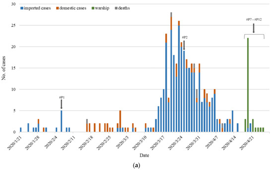 Figure 1a illustrates that by the end of April 2020, there had been 429 reported cases of SARS-CoV-2 infection in Taiwan, resulting in six deaths from COVID-19. Among these cases, eight early Taiwanese infections (#P1, #P2, and #P7–#P12) were identified and recruited from NYCU Hospital. The epidemiological information for these patients is as follows: Patient 1 (#P1) was a Taiwanese businessman residing in Wuhan, who returned to Taiwan for the Lunar New Year holidays and was confirmed on February 6. Patient 2 (#P2) was a student studying in the United States and was diagnosed with COVID-19 on March 27 upon her return to Taiwan. Patients 7–12 (#P7–#P12) were Navy crew members aboard the Panshi Fast Combat Support Ship and tested positive for the virus. Since their infections occurred while on the vessels and subsequently tested positive during the isolation period, their confirmed dates were approximately set between 19 April and 23 April (refer to Figure 1a). Although clinical samples were not collected from some patients at the onset of symptoms, nucleic acid detection was still performed using the concentrated extraction method of total RNA (Figure 1b and Table 1).