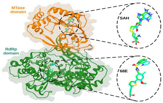 Molecular re-docking of co-crystallized ligands onto NS5 protein of serotype 3 of DENV (PDB 5JJR). SAH ligand in MTase domain, with an RMSD of 1.2 Å, and 68E ligand in RdRp domain, with an RMSD of 1.7 Å. The MTase and RdRp domains are represented in orange and dark green ribbons, respectively. The crystallized and predicted poses are shown in green and cyan sticks, respectively.