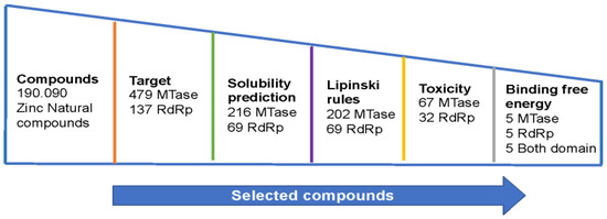 After selecting the binding sites and setting up the interaction boxes used in the compound search, virtual screening was performed. Initially, 190,090 natural compounds were docked to the two binding sites of interest (MTase and RdRp) in the four serotypes. This means that a total of eight virtual screenings and approximately 1,520,720 molecular dockings were performed on the NS5 protein models of DENV. The DrugDiscovery@TACC web portal [23] provided the top 1000 compounds for each screening, and the list was reduced to 8000 natural compounds (4000 for each domain). In order to identify compounds that may exhibit anti-Dengue effects, only compounds that interacted with the NS5 protein domains in all Dengue serotypes were selected. After verifying the compounds at each binding site, a total of 479 compounds were obtained in the MTase domain and 127 compounds were obtained in the RdRp domain in all four serotypes. Finally, physicochemical and toxicological property screening was performed. The solubility evaluation in aqueous systems allowed for the selection of 216 compounds for the MTase domain and 69 compounds for the RdRp domain. Then, the Lipinski rule compliance was checked, resulting in 202 compounds selected for the MTase domain and all previously identified compounds for the RdRp domain. The next analysis was based on the predictions of possible toxicological risks, which resulted in 67 compounds for the MTase domain and 32 compounds for the RdRp domain. The final selection of compounds was based on the binding energies. Five compounds were chosen for the MTase domain, five for the RdRp domain, and five with interaction in both domains (Table 1). The compounds were named according to the interaction site and the last two digits of the Zinc code. Based on the results, the compounds were acquired from Molport (https://www.molport.com/shop/index) (accessed on 30 August 2019) for synthesis and to begin the in vitro evaluation of the molecules’ activity against DENV-2.