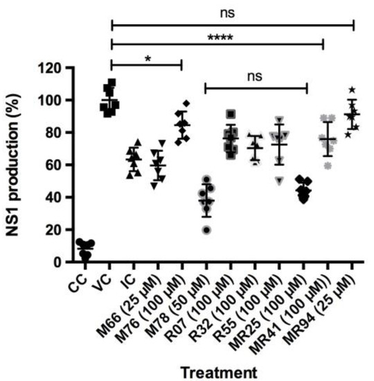 Percentage of NS1 protein production after treatment with compounds M66, M76, M78, R07, R32, R55, MR25, MR41, and MR94 in DENV-2 infected cells, as measured by ELISA. VC: Viral control, CC: Cell control, CI: Inhibition control (20 μM mycophenolic acid). Data are represented as mean and standard deviation (n = 7). One-way ANOVA analysis indicated statistically significant differences between the compounds and viral control (VC) (*** p < 0.001), (* p < 0.1; **** p < 0.0001), except for compound MR94. t-test indicated no difference between M78 and MR25 (ns: non-significant).