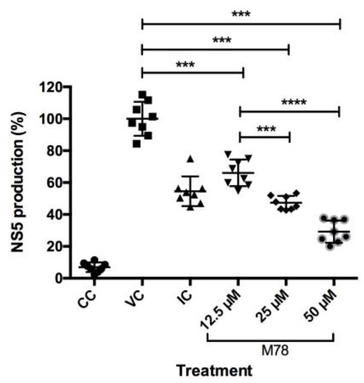 The compound M78 was selected because it showed the greatest reduction in NS1 protein production when compared to the other compounds, decreasing expression by approximately 60%, according to the previously described results (Figure 3). M78 was evaluated at lower concentrations to assess its effect on NS5 expression. The ELISA results are presented in Figure 4, indicating the percentage of protein production and showing dose-dependent reduction with statistically significant differences when compared to viral control (VC) (*** p < 0.001). However, treatment with the compound at three different concentrations reduced protein production to values close to those observed in the positive inhibition control. Nevertheless, there were statistically significant differences between the three treatments, indicating a greater effect of M78 at 50 µM, where NS5 production was close to 30% compared to VC (100%). The IC50 was estimated, with a value of 24.61 μM, and according the determined CC50, an SI of 2.5 was found.