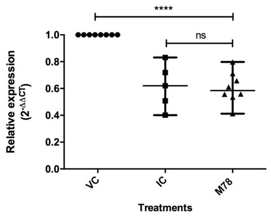 Figure 5 shows the relative expression levels for VC, IC, and M78 treatment. The results indicate statistically significant difference between treatment with M78 and viral control (**** p < 0.0001). Based on this, it is possible to state that the expression of the evaluated gene was reduced 1.7 times due to the compound treatment, with similar behavior to that of the inhibition control.
