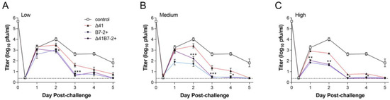 Titers of challenge virus shed from the genital mucosa. Groups of 10 BALB/c mice in each of two independent experiments were immunized once s.c. with a single (A) low (2 × 104 PFU), (B) medium (1 × 105 PFU), or (C) high (5 × 105 PFU) dose of supernatant-derived virus or an amount of control supernatant (control) equivalent to the high dose of virus. All mice were challenged 1 month after immunization by i.vag. infection with HSV-2 strain G-6. Titers of virus collected by vaginal swab of 6 mice per group (n = 12 total) at the indicated times post infection were determined by standard plaque assay. Data represent the geometric mean ± SEM for the compiled samples. *, p = 0.049–0.01; **, p = 0.009–0.001; ***, p = 0.0009–<0.0001 for Δ41 compared with Δ41B7-2+.