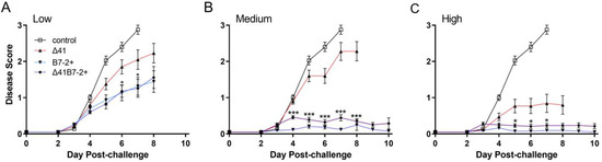 Genital inflammation and disease after i.vag. challenge of immunized mice. Mice as described in Figure 4 were immunized with a (A) low, (B) medium, or (C) high dose of virus or an amount of control supernatant corresponding to the high dose of virus. After the challenge, mice were observed daily for signs of inflammation and lesions on their external genitalia. Data represent the arithmetic mean ± SEM for all samples compiled from two independent experiments (n = 20). *, p = 0.0389–0.0178; ***, p < 0.0001 for Δ41 compared with Δ41B7-2+.