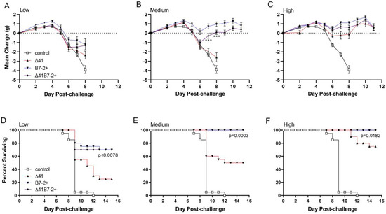 Body weight and survival after i.vag. challenge of immunized mice. Mice as described in Figure 4 were immunized with the low, medium, or high dose of virus or an amount of control supernatant corresponding to the high dose of virus. Body weight (A–C) and survival (D–F) were monitored over time after the challenge. Weight data represent the arithmetic mean ± SEM for all mice compiled from two independent experiments (n = 20). ***, p = 0.0002–<0.0001 for Δ41 compared with Δ41B7-2+.