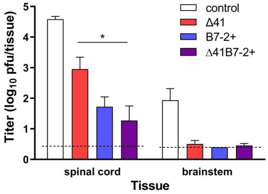 Compared with mice receiving control supernatant, prior immunization with Δ29Δ41 resulted in less challenge virus in the spinal cords (p = 0.014). Immunization with viruses expressing B7-2 further reduced the amount of challenge virus detectable in the spinal cord. Almost no challenge virus was detected in the brainstem of mice immunized with any of the vaccine strains at 5 d post challenge, though the challenge virus had already reached the brainstem in control mice (p = 0.0009–0.0002). Thus, all the vaccine strains provided significant protection against acute infection of the nervous system, with the best protection afforded by viruses expressing B7-2.