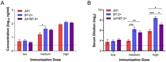 To define immune responses that correlated with protection mediated by the Δ29B7-2+ and Δ29Δ41B7-2+ viruses, we analyzed HSV-2-specific antibodies and T cell responses stimulated by vaccination. HSV-2-specific serum IgG was evoked by vaccination in a dose-dependent manner (Figure 8A).