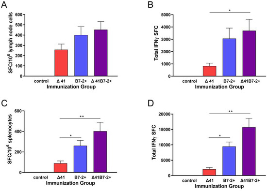Memory CD8 T cells, however, were markedly more prevalent in the spleens one month after immunization of mice with Δ29B7-2+ or Δ29Δ41B7-2+ than with Δ29Δ41, whether measured as epitope-specific cells per 106 cells (Figure 9C), or the total number of epitope-specific cells per spleen (Figure 9D). Thus, more HSV-specific, memory CD8 T cells were available at the time of the challenge in mice immunized with Δ29B7-2+ and Δ29Δ41B7-2+.