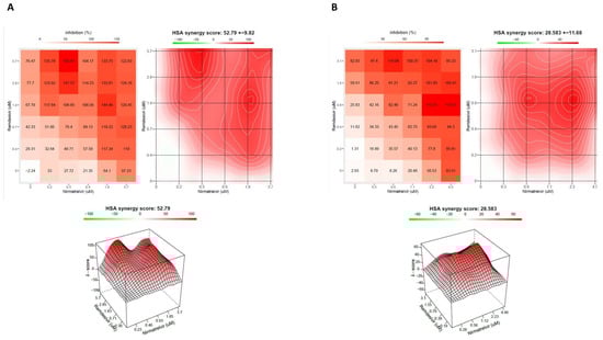 The interaction landscapes of the remdesivir–nirmatrelvir combination after 48 h (A) and 72 h (B) of incubation. A Vero E6 cell-based infection assay was used to investigate the in vitro activity of the combination. All experiments were performed using a 20A.EU1 Severe Acute Respiratory Syndrome Coronavirus 2 (SARS-CoV-2) strain. After the incubation, a viability assay was performed. To test whether the drug combinations act synergistically, the Highest Single Agent (HSA) reference model was calculated. An HSA score > 10 is considered synergic. Data are from 3 independent experiments performed in triplicate. Both panels (A,B) show, in order, numerical values across the matrices, synergy map and 3D plot.