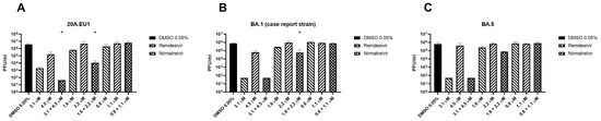 Viral titration (plaque reduction assay) of remdesivir–nirmatrelvir combination. After synergy tests (A) or yield reduction assay (B,C), supernatants of SARS-CoV-2 20A.EU1 (A), BA.1 (case report strain) (B) and BA.5 (C) infected Vero E6 cells treated with the antiviral combination were frozen and tested for viral load. Data are expressed as plaque-forming units (PFU)/mL (mean ± standard deviation, SD) from 2 or 3 experiments performed in triplicate. * p < 0.05, antiviral combination vs more active single agent. Viral eradication was defined as <50 PFU/mL, the detection limit of the method. (A): The combination at the concentration of 3.1 + 4.5 μM eradicated the virus. (B,C): remdesivir at the concentration of 3.1 μM and the combination at the concentration of 3.1 + 4.5 μM eradicated the virus.