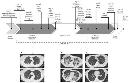 Case report timeline: A 50-year-old woman with a history of non-Hodgkin follicular lymphoma treated with anti-CD20 therapy was SARS-CoV-2 positive starting on 18 February 2022. Multiple nasopharyngeal swabs were collected and all tested positive. On 19 April, 4 May and 5 September, SARS-CoV-2 was isolated from nasopharyngeal swabs, and the viruses were identified as BA.1 variants. On 24 March, she underwent Computed Tomography (CT) that showed “multiple and diffuse areas of parenchymal opacities with a ground glass appearance, with a tendency to consolidation in sloping areas” (A). On hospital readmission, the clinical conditions immediately appeared critical with acute progressive respiratory failure due to extensive COVID-19 interstitial pneumonia, as shown in CT images (B): “Bilateral extensive consolidative foci, “crazy paving” and “ground glass” opacities are evident in the lung parenchyma””. The medical therapy was set as follows: antibiotic therapy, off-label antiviral therapy with remdesivir (10-day course) plus nirmatrelvir/ritonavir (5 day course), tixagevimab/cilgavimab, and dexamethasone (6 mg/die for 10 days). The patient presented an excellent clinical-radiological response with progressive reduction of oxygen requirement up to the suspension and improvement on control CT after 2 weeks (C). However, she required further off-label prolonged therapy with nirmatrelvir/ritonavir up to negativization obtained on 2 November 2022. NPS, nasopharyngeal swab; R, remdesivir; S, sotrovimab; D, dexamethasone; TC, tixagevimab/cilgavimab; N/R, nirmatrelvir/ritonavir; HFNC, high-flow nasocanula.