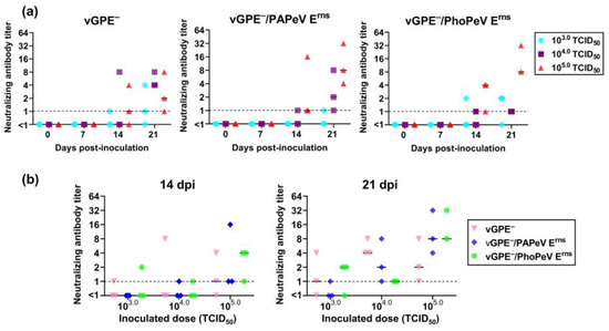 Neutralizing antibody titers in pigs inoculated with doses of 103.0, 104.0, and 105.0 TCID50 at 0, 7, 14, and 21 dpi. (a) Neutralizing antibody titers in pigs inoculated with vGPE−, vGPE−/PAPeV Erns, or vGPE−/PhoPeV Erns. (b) Neutralizing antibody titers at 14 dpi and 21 dpi in pigs inoculated with vGPE−, vGPE−/PAPeV Erns, or vGPE−/PhoPeV Erns at different doses of TCID50. The dot-plot graph shows individual titers with the median in each group of 103.0, 104.0, and 105.0 TCID50 (n = 9). Dashed horizontal lines show the detection limit.