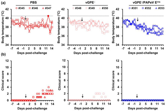 Body temperature and clinical scores of pigs in the first trial. Nine 2-week-old pigs were divided into three groups: PBS-vaccinated pigs (control) (red), vGPE−-vaccinated pigs (pink), and vGPE−/PAPeV Erns-vaccinated pigs (blue). (a) Individual body temperatures of pigs in each group. High fever was defined as a body temperature of ≥40.5 °C (dashed horizontal lines), as shown by the filled marker. (b) Clinical scores were monitored daily from –7 to 0 dpc until the end of the experiment. Clinical signs were scored on 10 parameters, ranging from 0 to 3 for each. The black arrow indicates the day of the virus challenge. All pigs were euthanized at 14 dpc.