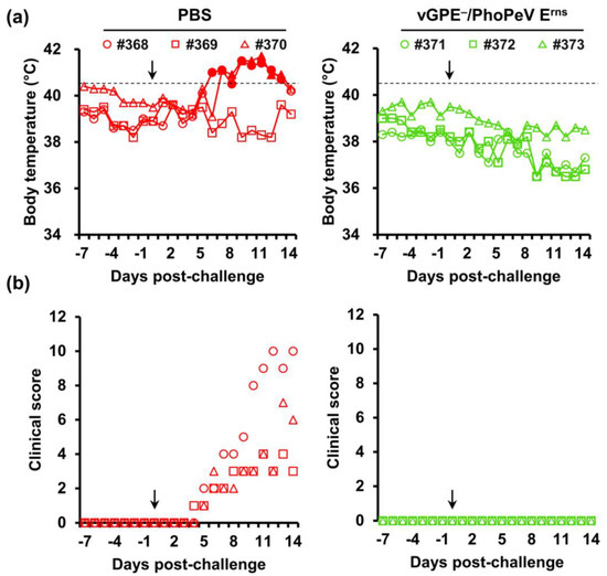 Body temperature and clinical scores of pigs in the second trial. Six 2-week-old pigs were divided into two groups: PBS-vaccinated pigs (control) (red) and vGPE−/PhoPeV Erns-vaccinated pigs (green). (a) Individual body temperatures of pigs in each group. High fever was defined as a body temperature of ≥40.5 °C (dashed horizontal lines), as shown by the filled markers. (b) Clinical scores were monitored daily from –7 to 0 dpc until the end of the experiment. Clinical signs were scored on 10 parameters, ranging from 0 to 3 for each. The black arrow indicates the day of the virus challenge. All pigs were euthanized at 14 dpc.