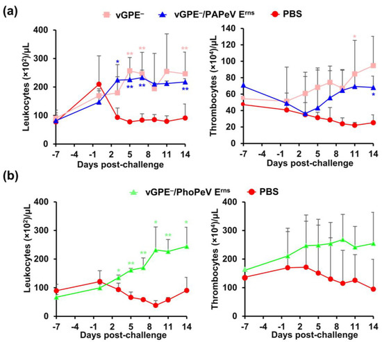 Leukocyte and thrombocyte counts of pigs in two challenge studies. (a) Pigs immunized with vGPE− or vGPE−/PAPeV Erns and PBS (control). (b) Pigs immunized with vGPE−/PhoPeV Erns and PBS (control). Blood was collected to measure leukocyte and thrombocyte counts at each time point at −7, 0, 3, 5, 7, 9, 11, and 14 dpc. The data are shown as mean values, with error bars representing SDs. The significance of differences was calculated using one-way ANOVA, followed by the Student’s t-test. * p < 0.05; ** indicates p < 0.01 between the vaccinated and control groups.