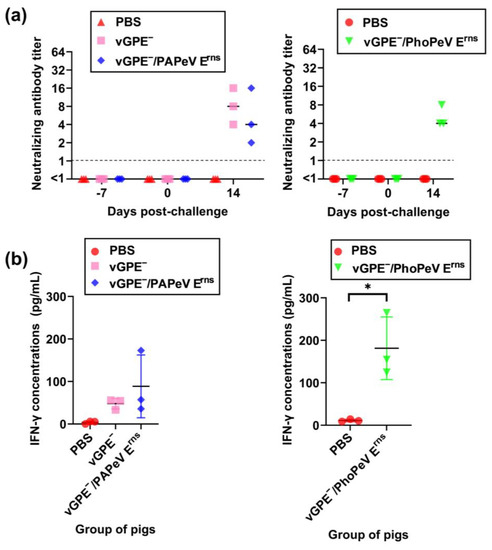 Neutralizing antibodies and cellular immune response in pigs after 7 days of vaccination. (a) Neutralizing antibodies in pigs vaccinated with vGPE−, vGPE−/PAPeV Erns, or vGPE−/PhoPeV Erns and PBS (control). Dashed horizontal lines show the detection limit. (b) Detection of IFN-γ concentrations in PBMC culture supernatant by ELISA. The data are shown as mean values, with error bars representing SDs. The significance of differences was calculated using one-way ANOVA, followed by the Student’s t-test. * p < 0.05, between the vaccinated and control groups.