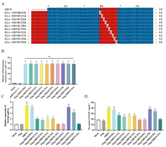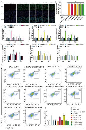 Han, C.; Xu, W.; Wang, J.; Hou, X.; Zhou, S.; Song, Q.; Liu, X.; Li, H. Porcine Circovirus 2 Increases the Frequency of Transforming Growth Factor-β via the C35, S36 and V39 Amino Acids of the ORF4. Viruses 2023, 15, 1602. https://doi.org/10.3390/v15071602