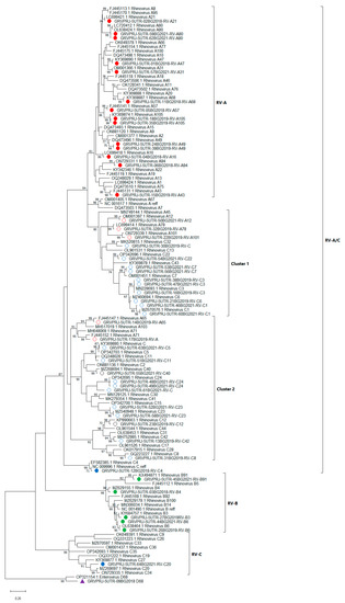 All of the 47 RV isolates identified in this study were first classified based on the sequence of the 5′UTR. RV strains were classified into three species—RV-A, B and C, with the help of the enterovirus automated genotyping tool. Thus, 19 types were detected as RV-A, 5 as RV-B, and 23 as RV-C. However, this instrument was insufficient for further genotyping of the isolated viruses. For further detailed genotype assignments based on 5′UTR, BLAST score and phylogenetic analysis were combined and a divergence threshold of <7% was used [8]. All isolates were grouped into three genetic clades—RV-A/C, RV-B and RV-C. The first clade comprises RV strains similar to RV-A and RV-C with three distinct subgroups—RV-A types and two mixed clusters—cluster 1 and cluster 2 (Figure 1).