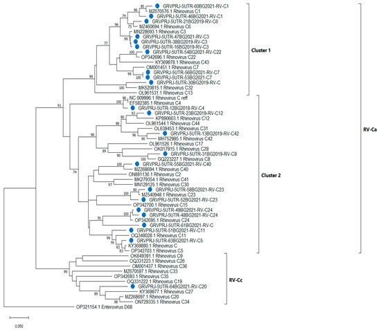 RVs are known for their high genetic diversity. To date, over 165 RV genotypes have been described. RVs are grouped into three species designated as Rhinovirus A (RV-A), Rhinovirus B (RV-B) and Rhinovirus C (RV-C). Previous studies have suggested that RV-C could be further classified into two subgroups: RV-Cc and RV-Ca, with the latter resulting from previous recombination with sequences related to RV-A [22,23]. Currently, type assignment is based on the pairwise identity of the nucleotide sequences of complete genomes, complete capsid proteins or VP1 genes [24]. Some studies also describe the use of the highly conserved nucleotide sequences of the 5′UTR and VP4/VP2 regions for rhinovirus subtyping [4,8,25,26].
