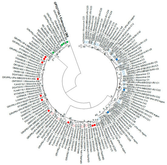 Phylogenetic tree based on the VP4/VP2 region of RV, constructed by the maximum-likelihood method with 1000 bootstrap iterations. Tree branches are proportional to genetic distance, and all bootstrap values greater than 90 are shown at the branches. Reference sequences are represented by GenBank accession numbers and strains. Isolates from clinical samples are indicated by a sample ID number, collection year and strain. Strains most similar to RV-A reference strains are shown in red, strains most similar to RV-B reference strains are shown in green, and strains most similar to RV-C reference strains are shown in blue. The strains in mixed clusters 1 and 2 from the previous analysis are indicated by circles. Enterovirus D68 was used as an outgroup.