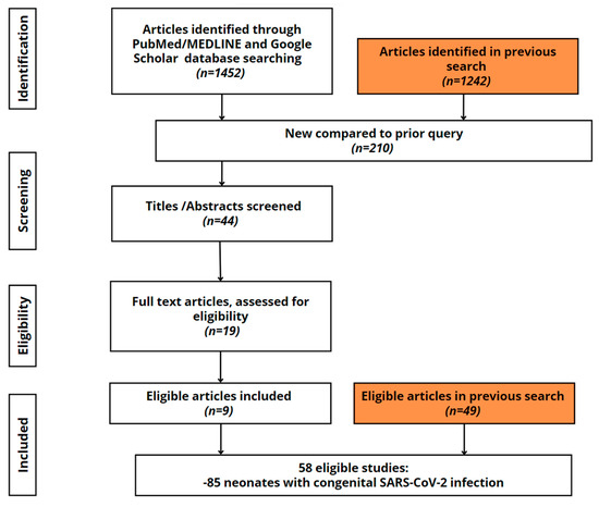 Individual participant data inclusion flow diagram. The orange boxes represent the findings of a prior scoping review [30]. In this case, three articles were excluded as birth occurred before 24 weeks of gestation. A total of 210 new articles were found, 44 of which were screened. Only nine publications remained suitable for the research once the inclusion criteria were applied. There were 58 studies in all, with 85 newbornswith confirmed or possible congenital SARS-CoV-2 infection.