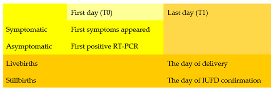The method employed to determine the time lapsed (ΔT- measured in days) between the commencement of infection (T0) and the outcome of the pregnancy(T1) was different depending on the outcome of pregnancy and the mother’s condition. For asymptomatic pregnant patients, the first day of the count began on the day when a positive maternal PCR-SARS-CoV-2 test was acquired (Figure 1). T0 was the first day when symptoms manifested in symptomatic individuals. In the event of live births, the last day (T1) of the count was the day of delivery, whereas, in the case of stillbirths, it was the day when IUFD was confirmed (Figure 2).