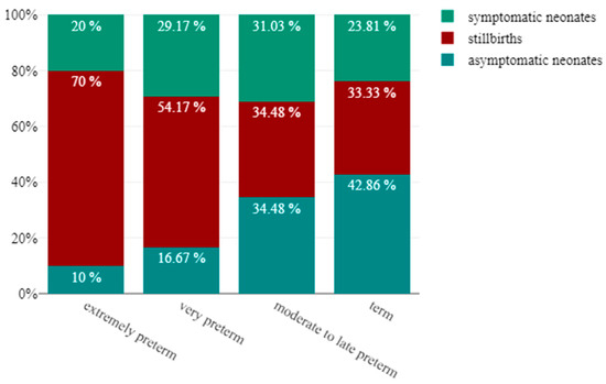 Degree of prematurity stratified by neonatal outcome (%). As GA advances, the rate of asymptomatic neonates rises (from 10% to 42.86%), and there is a decline in the stillbirth rate (from 70% to 33.33%). The rate of symptomatic neonates does not change drastically in the three categories of prematurity and term newborns (20% in the extremely preterm group, 29% in the very preterm group, 31.03% in the moderate to late preterm group and 23.81% in the neonates delivered at term).