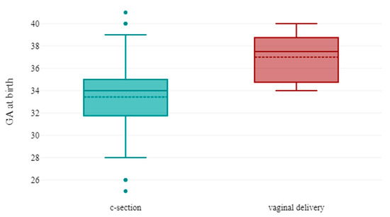 Boxplot represents mode of delivery in function of gestational age at birth. Premature newborns were more likely to be delivered by c-section.