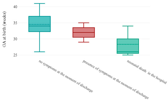As far as gestational age at birth is concerned, it varied from 24 to 41 weeks. There was no difference between gestational age at birth in symptomatic and asymptomatic newborns (median = 34); however, stillbirth occurred in median at 32 weeks of gestation (p-value = 0.016).