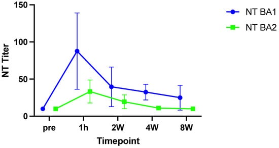 Before the infusion of Sotrovimab, all KTRs tested negative in the Omicron-BA1- and BA2-specific live-virus NTs (all titers < 10). As shown in Figure 1, one hour after infusion, mean neutralization titers against BA1 peaked at 88 (SD: +−51) and decreased to 40 (SD: +−26), 33 (SD: +−10.60) and 25 (SD: +−16) at two, four and eight weeks, respectively. Overall, live-virus NT titers against BA2 were lower compared to BA1 peaking at 33 (SD: +−15), one hour after infusion. Titers subsequently decreased to 20 (SD: +−9) at week two, and were already negative at week four in all but two patients.