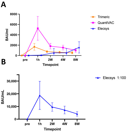 Antibody measurements by (A) TrimericS CLIA (Orange), QuantiVAC ELISA (pink), Elecsys systems (blue) and (B) Elecsys after 1:100 dilution. Initial increase after infusion is followed by reduced antibodies over time, as expected. For the Elecsys system, a prior 1:100 dilution is necessary due to a presumed prozone effect. Shown are mean and standard deviation.