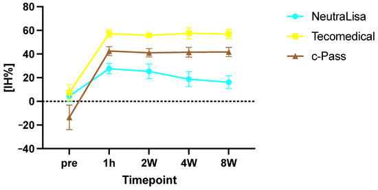 Surrogat neutralization test results determined with the NeutraLISA (blue), Teicomedical (yellow) and cPass system (brown). Signal inhibition (IH%) increased after infusion and remained high over the entire observational time. Shown are mean and standard deviation.