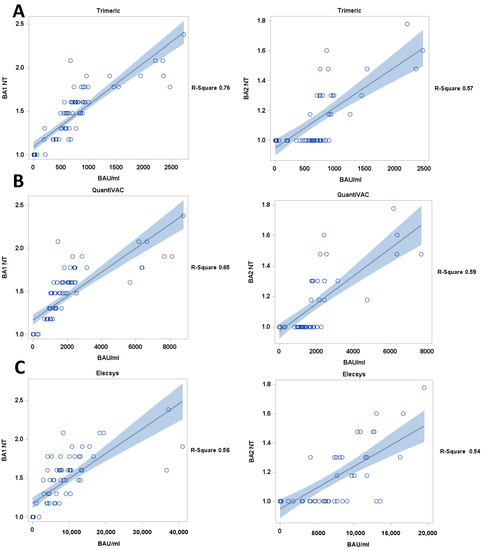 Correlation of antibody levels (BAU/mL) and live-virus BA1 and BA2 NT titers, (A) TrimericS and (B) QuantiVAC an (C) Elecsys (diluted samples) assay. black line: regression line, blue: confidence limits; Y axis = BA1 NT titers, BA2 NT titers.
