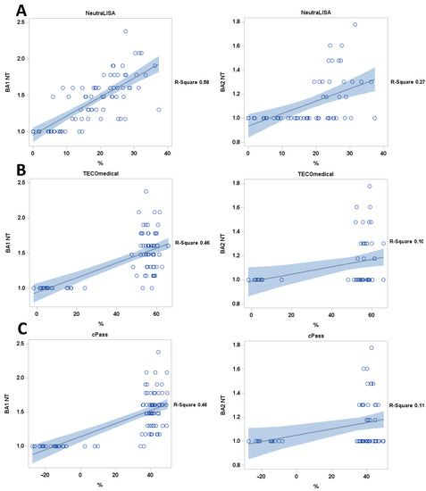 Correlation of sVNTs (A) NeutraLISA, (B) TECOmedical and (C) cPass with live-virus NT titers. All sVNTs show poor correlation with live-virus NT results. black line: regression line, blue: confidence limits; blue dotted blue lines: prediction limits; Y axis = BA1 NT titers, BA2 NT titers.