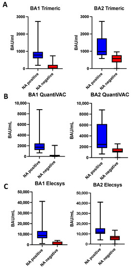 Measured antibody levels (BAU/mL) with the Elecsys (A), TrimericS (B) and QuantiVAC (C) assays stratified by live-virus NT results. Shown are median, first and third quartile.