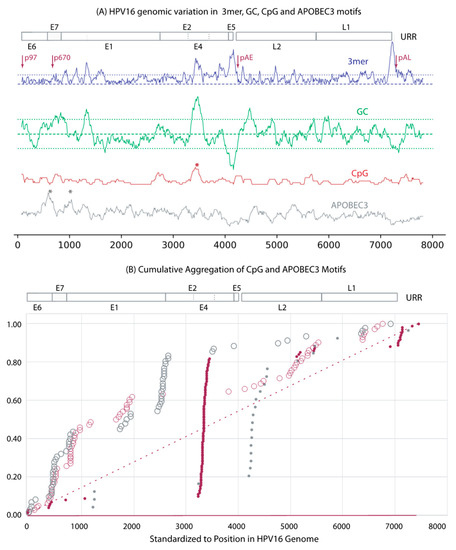 - Zhu, B.; Xiao, Y.; Yeager, M.; Clifford, G.; Wentzensen, N.; Cullen, M.; Boland, J.F.; Bass, S.; Steinberg, M.K.; Raine-Bennett, T.; et al. Mutations in the HPV16 genome induced by APOBEC3 are associated with viral clearance. Nat. Commun. 2020, 11, 886. [Google Scholar] [CrossRef]