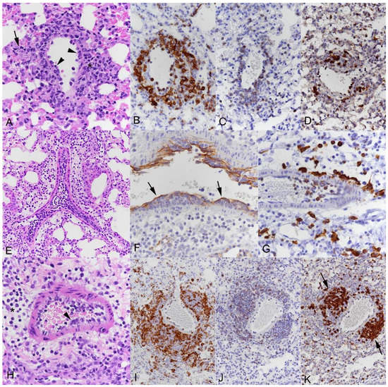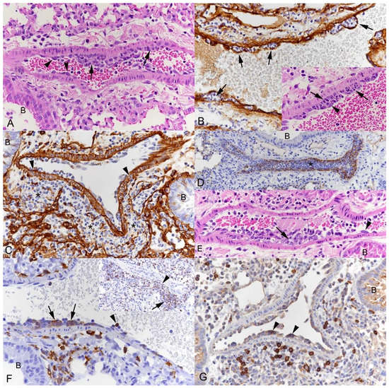 Lungs of C57BL/6J mice after intranasal infection with IAV X31 at 103 PFU. (A–D) C57/Bl6 mouse, 5 dpi. Leukocyte recruitment from veins in the parenchyma and perivascular accumulation (arrow). (A) Focal parenchymal necrosis and loss of infected alveolar epithelial cells, with mild leukocyte infiltration (*); inset: Viral antigen expression in type I pneumocytes (arrowhead) and degenerate, desquamated cells (arrow). Veins in the vicinity exhibit activated endothelial cells (arrowheads) and perivascular leukocyte infiltration (arrow). HE stain. (B,D) K18-hACE2 mouse, 6 dpi. Affected veins. Monocytes (Iba1+; B), T cells (CD3+; C) and to a lesser extent B cells (CD45R/B220+; C: Inset) are recruited from the blood and seen attached to the endothelium (arrowheads) and accumulating outside the vein (arrows). Immunohistochemistry, hematoxylin counterstain. (D–G) Muscular vein with leukocytes attached to the endothelium and small subendothelial leukocyte aggregates. (D) B: Bronchiole. HE stain. (E,F) Staining for CD31 (E), an endothelial cell marker, highlights leukocytes beneath the endothelium (arrowheads), and staining for laminin (F) shows their presence between the basement membranes of endothelial cells and smooth muscle cells (arrow). Immunohistochemistry, hematoxylin counterstain. (G) Monocytes (Iba1+) are present attached to and beneath the endothelial cells (arrowhead). Immunohistochemistry, hematoxylin counterstain.