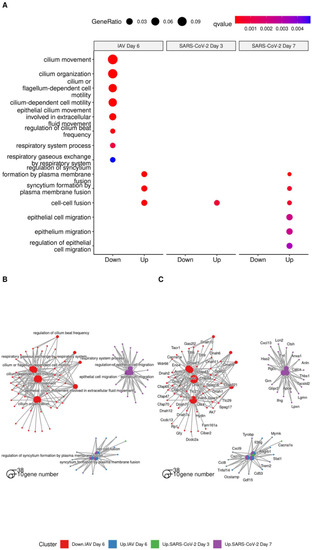 To further explore the vascular response and to investigate the difference with regard to the damage that SARS-CoV-2 and IAV induce in the lung at the transcriptional level, we utilized RNAseq data generated previously [38]. Differential gene expression analysis was conducted, followed by an enrichment analysis with ClusterProfiler. Overrepresented biological process terms associated with epithelial alterations and vasculitis were extracted for visualization and to identify genes that were associated with enrichments. Results from compareCluster were plotted with the cnet function to examine the networks within the dataset (Supplementary Figure S3). As we were interested in specific transcriptional responses, we interrogated the data for specific terms. Figure 6A shows selected gene ontology terms associated with epithelial damage. At day 6 post-IAV infection, downregulation of transcripts associated with cilium movement and organization was observed, consistent with the respiratory epithelial damage histologically observed at this time point [36,38]. Figure 6B,C reveal the biological complexity, where the same gene contributes to multiple annotations.