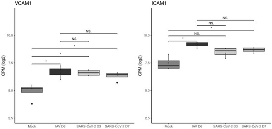 The TMM normalized log2 counts per million (cpm) of VCAM-1 and ICAM-1 for each animal within each group (n = 4) were plotted as boxplots. Pairwise comparisons between mock-infected and virus-infected groups and between IAV- and SARS-CoV-2 Pango B-infected groups were made with the “ggsignif” package and a Wilcoxon test. * p < 0.05, NS: Not significant. The points (●) represent outliers.