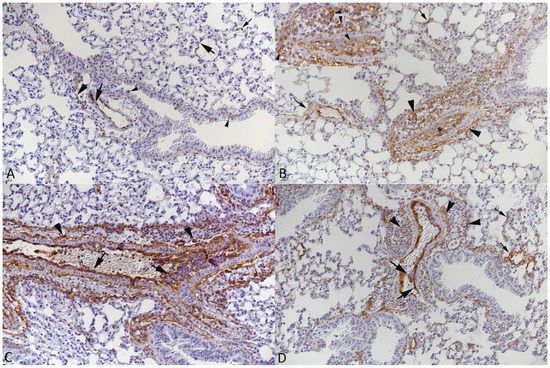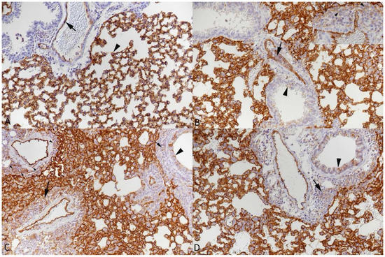ICAM-1 expression was overall more widespread, as was observed in endothelial cells of all blood vessels and capillaries in the alveolar walls (Figure 11A). The staining pattern remained the same after virus infection. In addition, infiltrating leukocytes in affected vessels were found to be positive, and some reaction was seen on the luminal surface of bronchiolar epithelial cells, which was least intense with SARS-CoV-2 infection (Figure 11B–D).