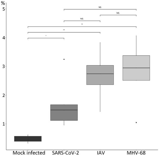 For all groups (mock infected, MHV-68, IAV, SARS-CoV-2), the result of the Shapiro–Wilk normality test indicated that the data had a normal distribution. The F-test, conducted under the null hypothesis (H0) that the variance of both groups in a comparison pair was equal, revealed that while the variances for the virus-infected groups were equal for the evaluated pairs (MHV-68–IAV; MHV-68–SARS-CoV-2; SARS-CoV-2–IAV), the variances were not equal for the virus-infected–mock-infected comparison pairs (control–MHV-68; control–IAV; control–SARS-CoV-2). Therefore, the first were analyzed with a t-test, while the second were analyzed with a Welch test.