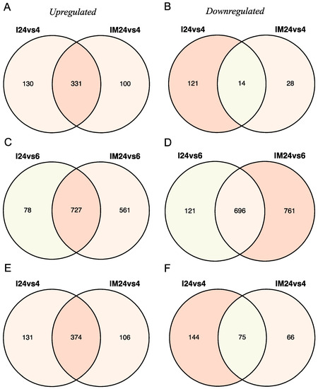 Venn diagrams register the amount of up- or downregulated DEGs in epithelial lung cancer cells infected with Beta-CoVs: (A,B) SARS-CoV; (C,D) MERS-CoV; and (E,F) SARS-CoV-2. For RNA–RNA interaction analyses, the intercepted DEGs between comparisons are considered: (i) mock cells between the final and initial time (MM) (no significant), (ii) infected cells upon post-infection against onset (II) and (iii) the comparison of infected cells with the respective mock cells (IM). Venn diagrams sections are colored based on the number of DEGs. The number of significant DEGs are shown for comparisons including 24 vs. 4 h post-infection and 24 vs. 6 h post-infection.