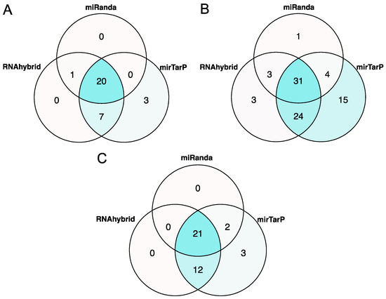Potential common hsa-miRNA:3′UTR pairings predicted by RNAhybrid, miRanda, and mirTarP in Beta-CoVs: (A) There are 20 interaction pairs in SARS-CoV; (B) 31 in MERS-CoV; and (C) 21 in SARS-CoV-2. Venn diagram sections are colored based on the number of pairing predictions.