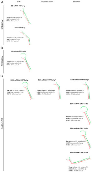 In more detail, RNA–RNA bindings in SARS-CoV and MERS-CoV carried two and one vsRNAs only in bats (SB-vsRNA-ORF1a-3p; SB-vsRNA-S-5p) and (MB-vsRNA-ORF1b-3p) with an MFE between −20.9 and −27.7 kcal/mol, respectively (Figure 4A,B). Conversely, SARS-CoV-2 showed vsRNAs across the three hosts: one in bat viruses (S2B-vsRNA-ORF1a-5p), one in intermediate animals (S2I-vsRNA-ORF1a-5p), and four in humans (S2H-vsRNA-ORF1a-5p; S2H-vsRNA-ORF1a-3p; S2H-vsRNA-ORF1b-3p; S2H-vsRNA-ORF3a-3p), where the MFE ranged from −22.1 to −26.1 kcal/mol (Figure 4C).
