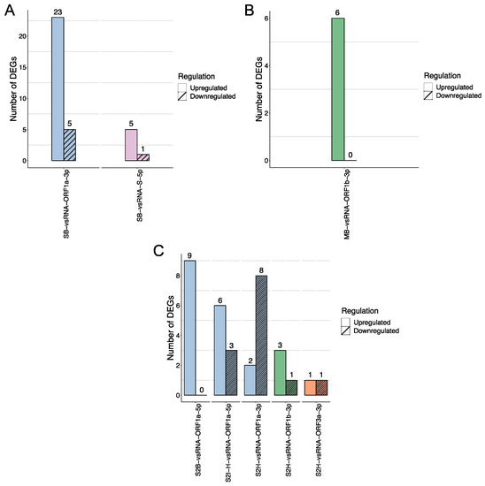 Considering that our assumption relies on RNA–RNA interactions acting in a vsRNA fashion, capable of exploiting host machinery as miRNA-like molecules to regulate host transcriptional reprogramming [20], we selected the targets identified and cross-validated them with the list of DEGs for each Beta-CoV vsRNA. Out of the 1998 putative targets, 74 (55 up- and 19 downregulated) were detected as DEGs targeted by vsRNAs that were likely regulated upon infection (Figure 5). In particular, 34 DEGs (46% each) were identified for SARS-CoV (two vsRNAs: 28 up- and 6 downregulated) and SARS-CoV-2 (five vsRNAs: 21 up- and 13 downregulated) (Figure 5A,C). Conversely, the only MERS-CoV vsRNA detected six DEGs (14%) that were upregulated (Figure 5B). Interestingly, most of the vsRNAs targeting DEGs were detected in ORF1a, 56 (41%); followed by ORF1b, 10 (7.4%); S, 6 (4.4%); and ORF3a, 2 (1.5%). In addition, 40 (72%) and 16 (84%) of up- and downregulated DEGs were in ORF1a, suggesting a critical viral gene modulating the host transcriptome.