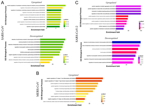 Functional enrichment analysis of DEGs regulated by Beta-CoV vsRNAs. Over-representation analysis for gene ontology showing biological process with adjusted p-value < 0.05 using a Fisher’s test for up- and downregulated DEGs in (A) SARS-CoV, (B) MERS-CoV, and (C) SARS-CoV-2. Each horizontal bar depicts a term and is grouped based on the ontology hierarchy, where the term in bold is the most relevant.