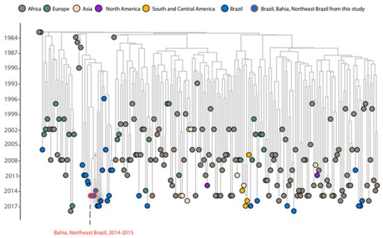 - Delatorre, E.; Couto-Fernandez, J.C.; Guimarães, M.L.; Cardoso, L.P.V.; de Alcantara, K.C.; Stefani, M.M.d.A.; Romero, H.; Freire, C.C.M.; Iamarino, A.; de A Zanotto, P.M.; et al. Tracing the origin and northward dissemination dynamics of HIV-1 subtype C in Brazil. PLoS ONE 2013, 8, e74072. [Google Scholar] [CrossRef][Green Version]
